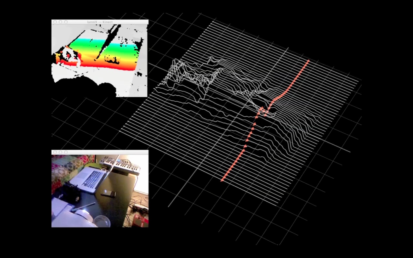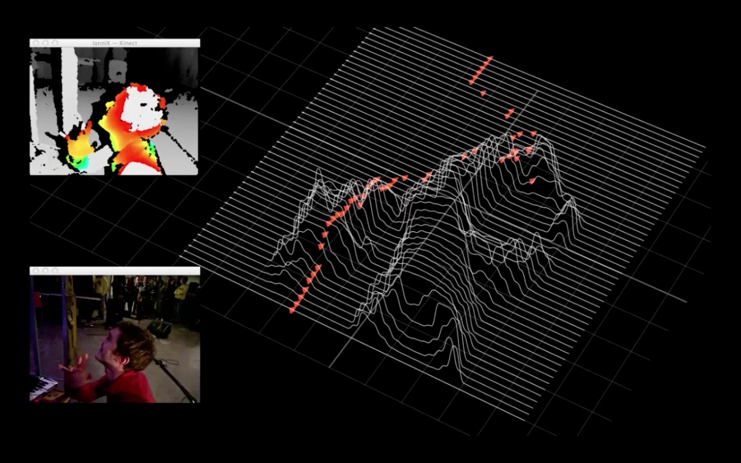 Digital sound design is made using IanniX + Kinect linked with Max/MSP. Kinect measures distances in real world and modifies 3D space in IanniX. Each line affects the intensity of a resonator (filtering white noise) and parameters of Gendy synthesizer in Max.